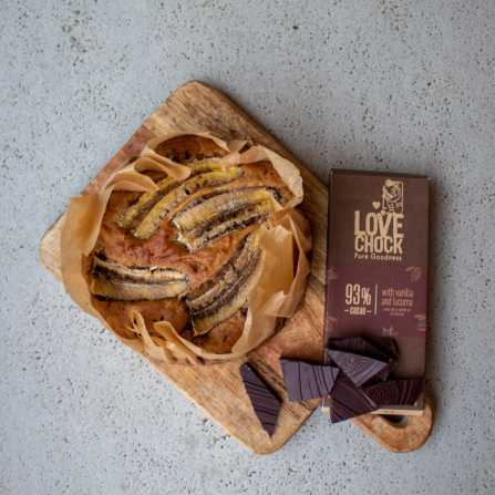 In another bowl, mix the flour, baking soda, baking powder, pinch of salt and the cinnamon. When done, mix the flour mixture little by little into the banana mixture. Chop the Lovechock chocolate into small pieces and mix into the mixture.
