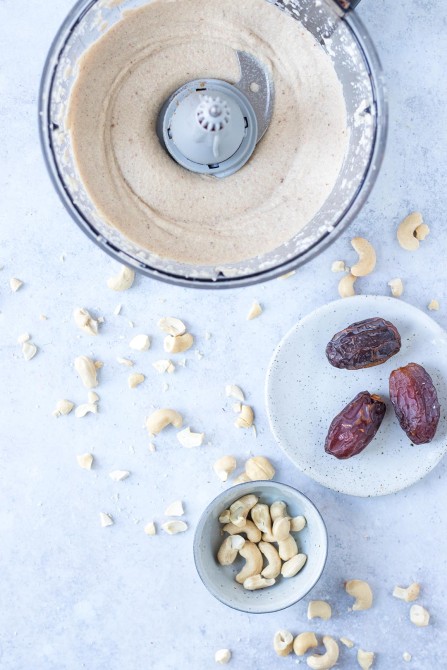 3. Doe de cashewnoten samen met het water, de medjoul dadels en het vanille extract in de keukenmachine. Mix 7-10 minuten tot een romig en zacht geheel.