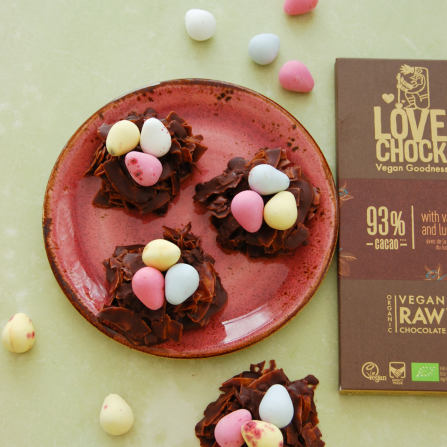 Shape +/- 6 bird nests with the chocolate covered flakes, on a baking sheet lined with parchement paper.