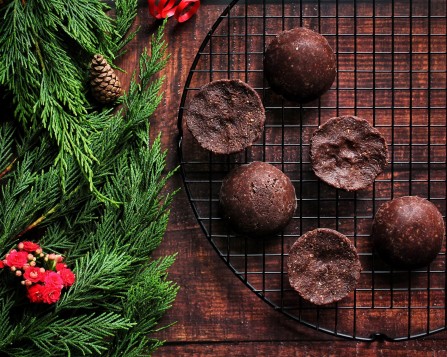 Mix all the ingredients together and refrigerate the dough for about 30 minutes. Then, divide and place the dough into hemispheres silicon moulds (up to one third of the mould). Keep cool.