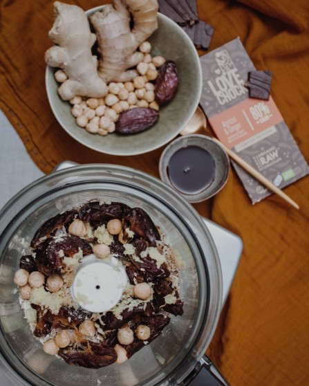Plaats alle ingrediënten behalve de chocolade en versiering in een food processor en mix tot een massa.
