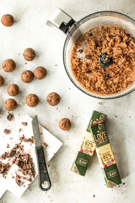De Lovechock "Turmeric Tulsi" reep wordt met een mes in kleine stukjes gehakt. De gehakte chocolade stukjes worden dan in het deeg gevouwen. De "Turmeric Tulsi" reep is zeer aromatisch en past perfect in de smakelijke tijgernoot blissballs.